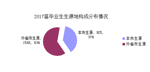 2017屆畢業(yè)生生源地域分布情況,本市生源學(xué)生925人,占畢業(yè)生總數(shù)37.4%,較去年減少了8.3%;京津冀地區(qū)生源共計1102人,占畢業(yè)生總數(shù)44.6%。