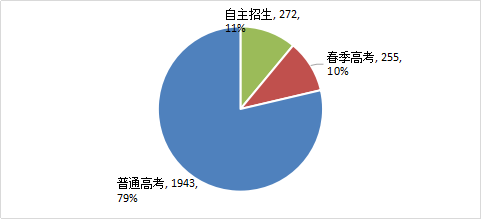 2017屆畢業(yè)生入學(xué)形式分布情況,自主招生學(xué)生272人,占畢業(yè)生總數(shù)11%;春季高考學(xué)生255人,占畢業(yè)生總數(shù)10%;普通高考學(xué)生1943人,占畢業(yè)生總數(shù)79%。