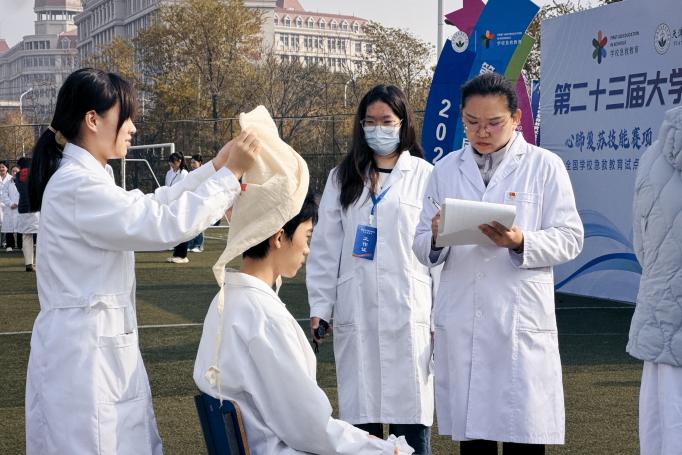 決賽現(xiàn)場(chǎng),參賽選手們?cè)谛姆螐?fù)蘇、頭部包扎項(xiàng)目中展開(kāi)激烈角逐,精準(zhǔn)完成判斷意識(shí)、按壓通氣、傷口包扎等規(guī)范操作,評(píng)委們嚴(yán)格依照我校牽頭制定的“全國(guó)學(xué)校急救教育技術(shù)培訓(xùn)標(biāo)準(zhǔn)”進(jìn)行細(xì)致評(píng)判。最終,表現(xiàn)優(yōu)異的學(xué)生獲得了京津冀學(xué)校急救教育試點(diǎn)院校省級(jí)協(xié)作組聯(lián)合認(rèn)證的急救技術(shù)能力證書(shū),為學(xué)生職業(yè)能力增添有力佐證。